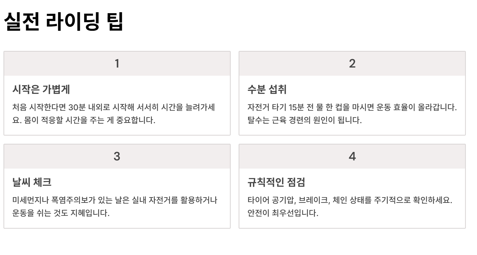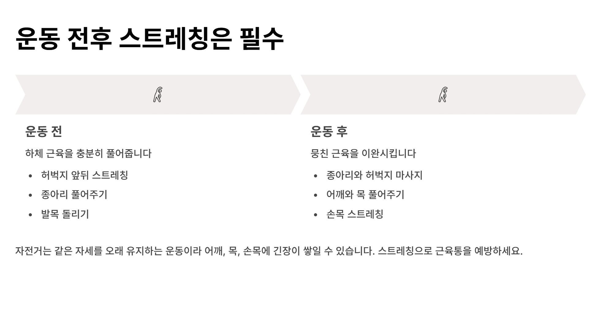 자전거는 같은 자세로 오래 유지하는 운동이라 어깨와 목, 손목에 긴장이 쌓일 수 있습니다. 타기 전에는 하체 근육을 풀고, 탄 후에는 뭉친 종아리와 허벅지를 충분히 스트레칭해 주는 것이 근육통 예방의 비결입니다.