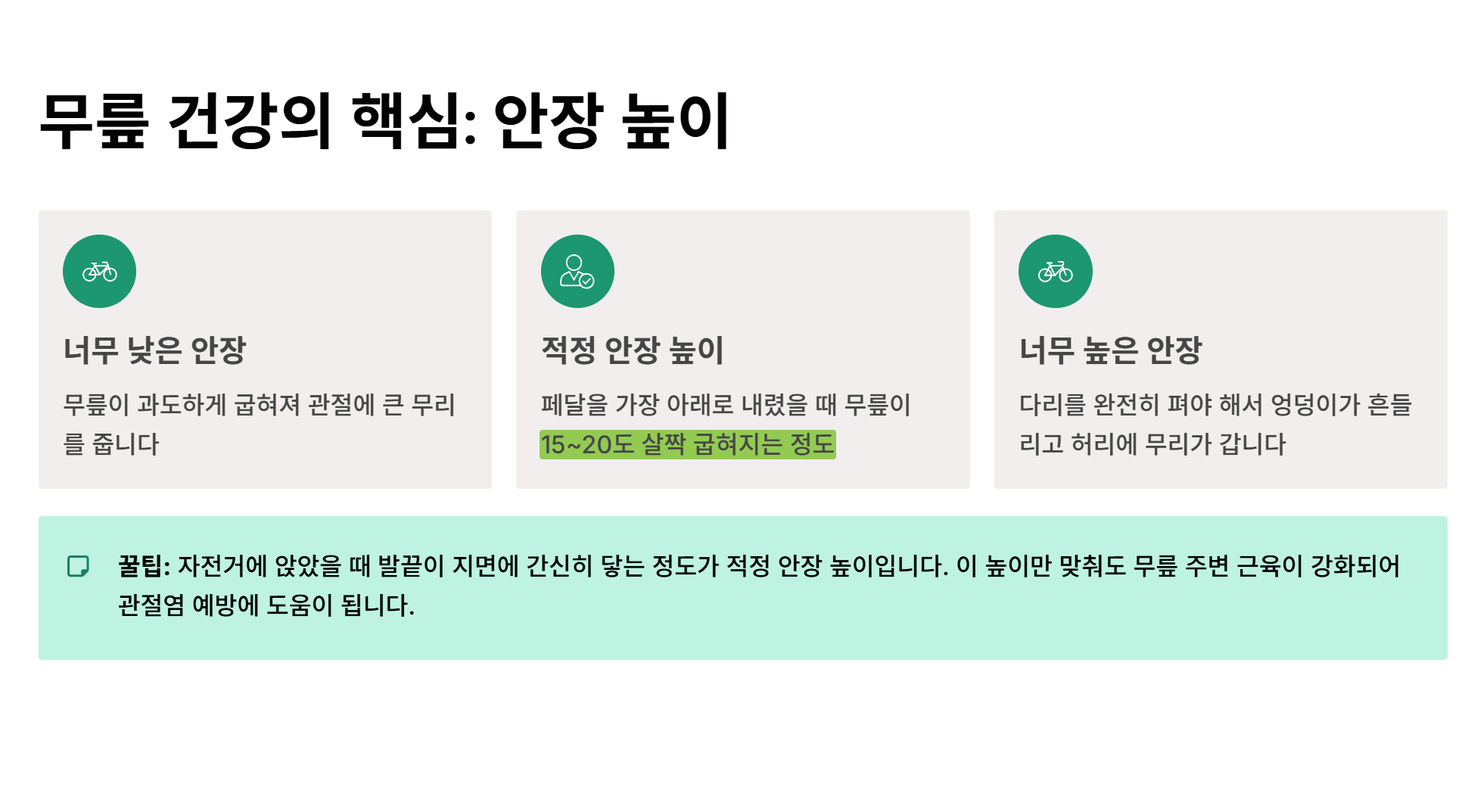 자전거에 앉아 페달을 가장 아래로 내렸을 때, 무릎이 살짝(약 15~20도) 굽혀지는 정도가 가장 적당합니다. 이 높이만 제대로 맞춰도 무릎 주변 근육이 강화되면서 오히려 관절염 예방에 도움을 주는 운동이 됩니다.