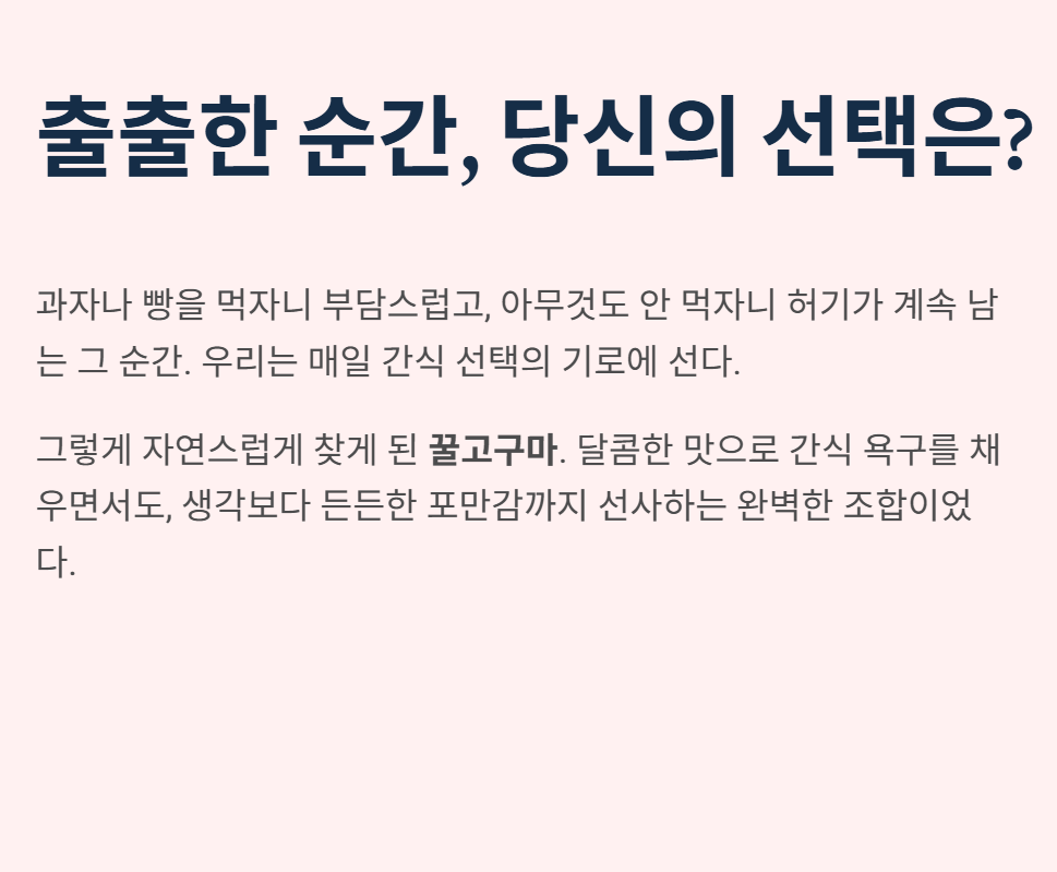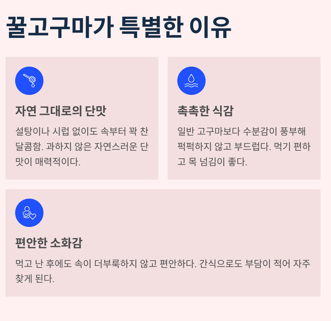 처음 꿀고구마를 먹었을 때 가장 인상적이었던 건 단맛이었다. 설탕이나 시럽을 더하지 않았는데도 속이 꽉 찬 단맛이 느껴졌다. 일반 고구마보다 수분감이 많아서 퍽퍽하지 않았고, 식감도 부드러웠다, 먹기 편했다.