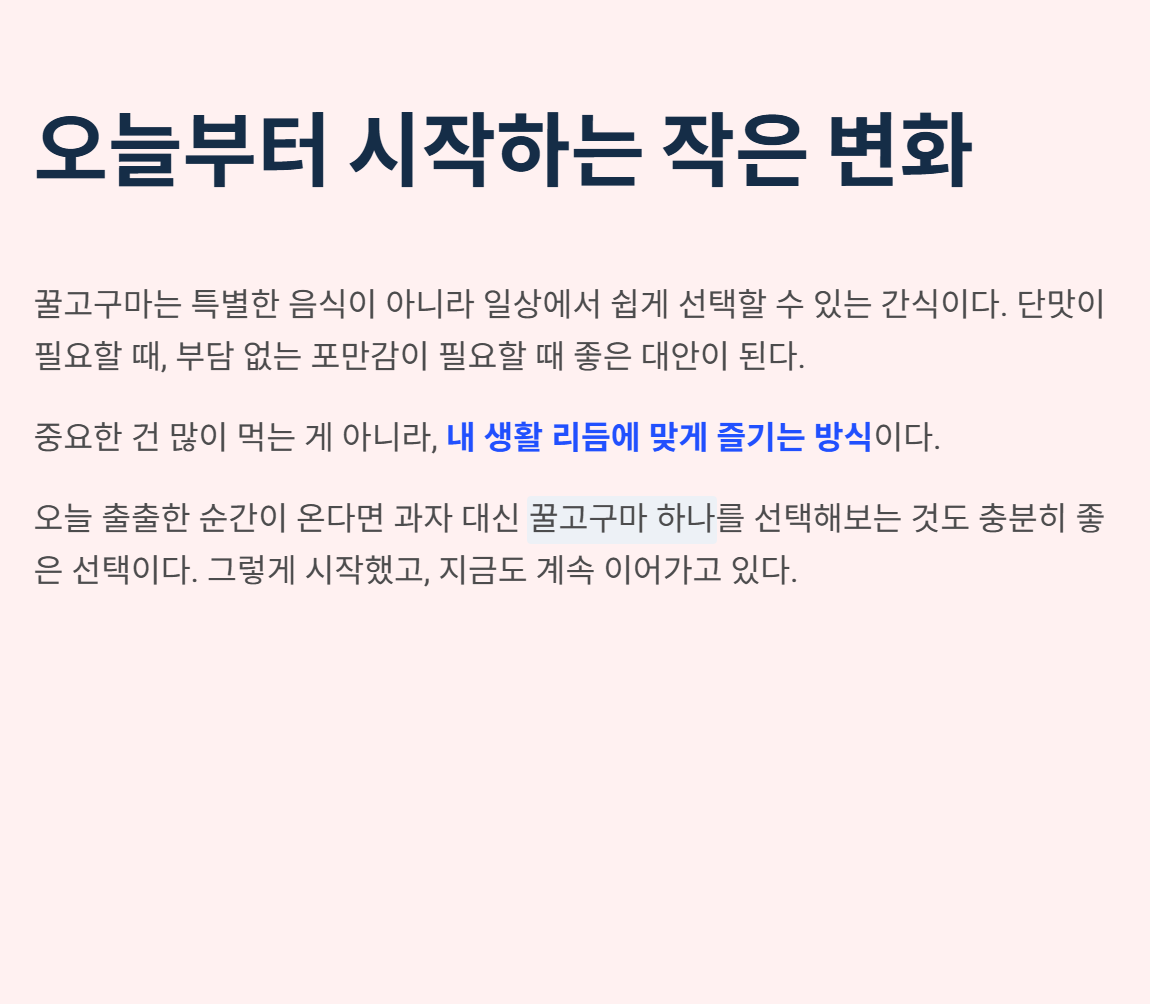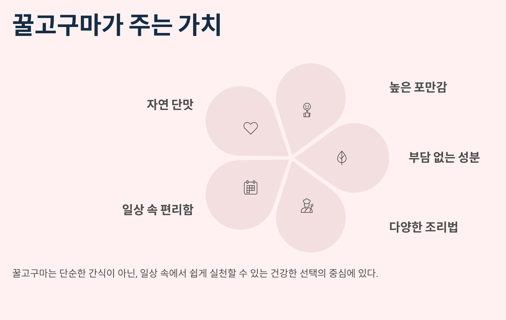 꿀고구마는 특별한 음식이 아니라 일상에서 쉽게 선택할 수 있는 간식이었다. 단맛이 필요할 때, 부담 없는 포만감이 필요할 때 좋은 대안이 됐다. 중요한 건 많이 먹는 게 아니라, 내 생활 리듬에 맞게 즐기는 방식이었다.