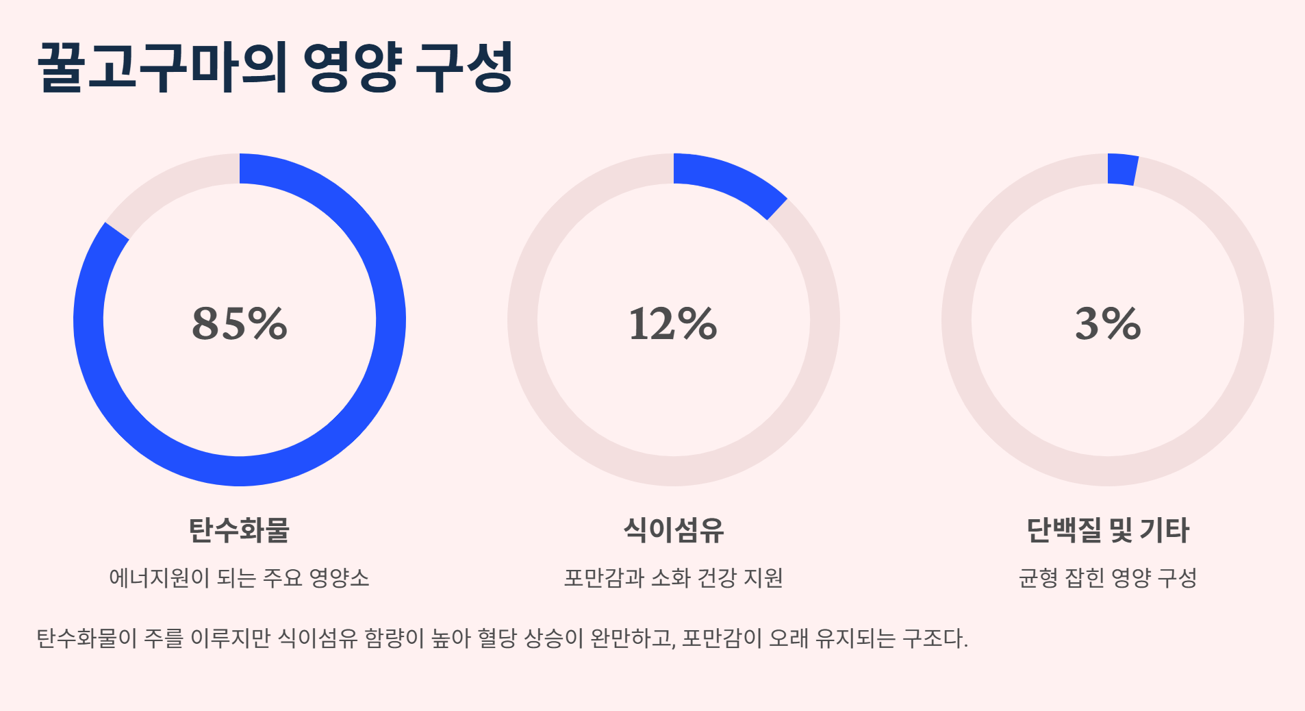 꿀고구마는 탄수화물 위주의 식품이지만, 식이섬유가 풍부해서 포만감이 오래 갔다. 하나만 먹어도 허기가 쉽게 가라앉았고, 불필요한 간식 섭취가 줄어들었다. 직접 먹어보며 가장 크게 느낀 장점이었다, 체감이 분명했다.