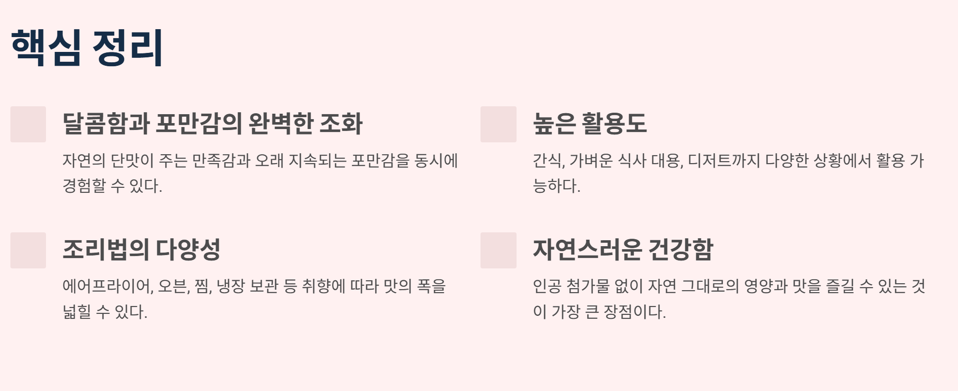 먹고 난 뒤에도 속이 더부룩하지 않고 편안했다. 단맛이 강한데도 과하게 달다는 느낌이 없어서, 간식으로도 부담이 적었다. 그래서 자연스럽게 빵이나 디저트 대신 선택하게 됐다, 습관처럼 찾게 됐다.