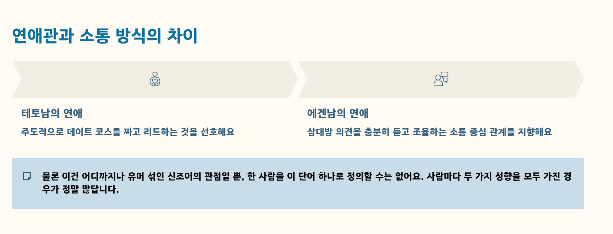 사실 이런 단어들은 재미로 시작되었지만, 자칫 잘못하면 누군가를 프레임 안에 가두는 도구가 될 수도 있습니다. "너는 테토남이니까 이럴 거야" 혹은 "에겐남이라서 소심해"라는 식으로 편견을 갖는 건 지양해야 할 부분이라고 생각해요.