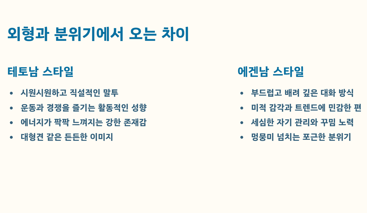 - 에겐남: 에스트로겐이 느껴지는 다정한 남자. 섬세함, 공감 능력, 부드러운 매력이 특징.
