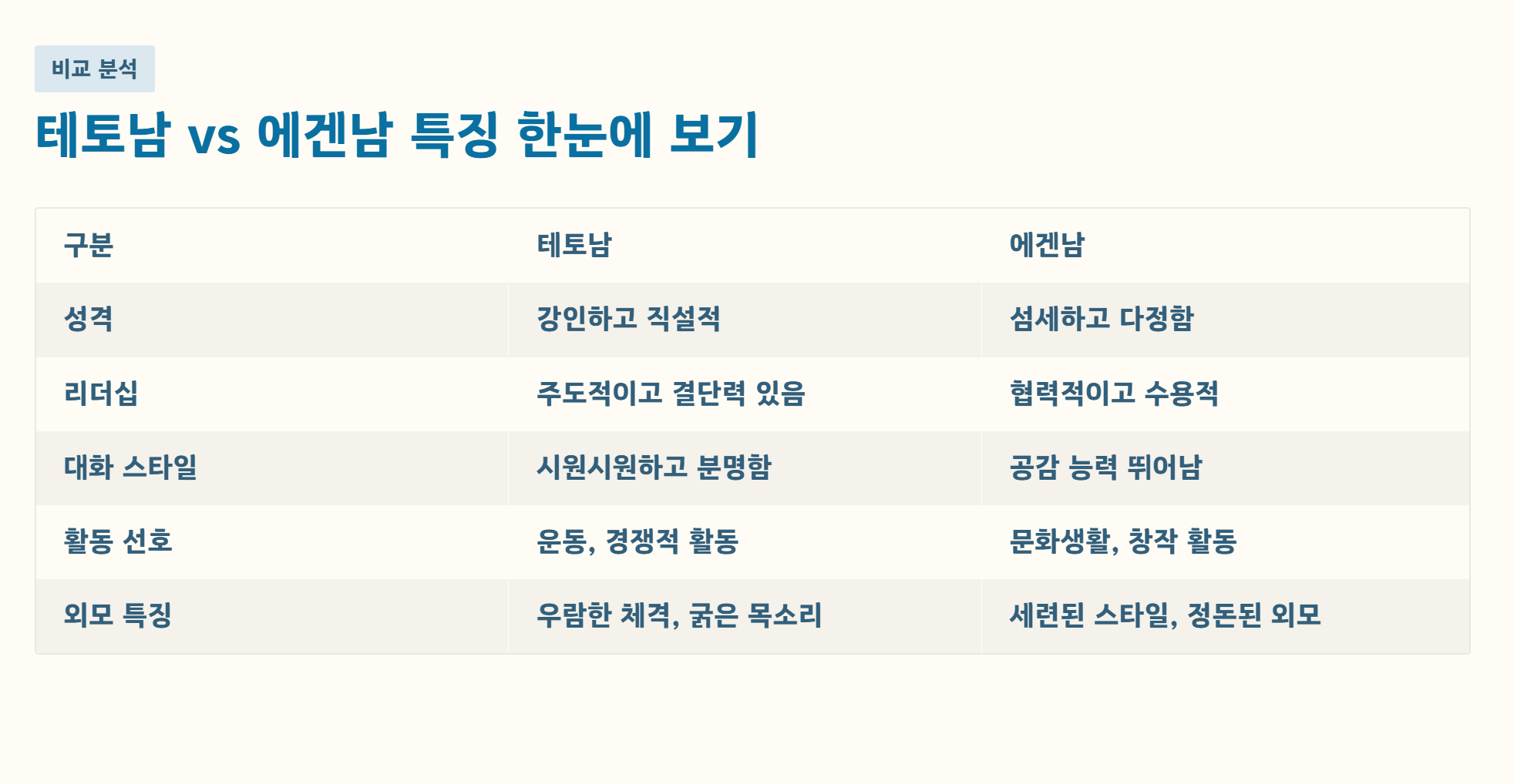 제가 주변 지인들을 떠올려보며 비교해 보니 확실히 분위기 차이가 느껴지더라고요. 테토남 스타일인 분들은 대체로 직설적이고 시원시원한 성격이 많습니다. 운동이나 경쟁적인 활동을 즐기는 편이라 겉으로 보기에도 에너지가 팍팍 느껴지는 경우가 많죠.