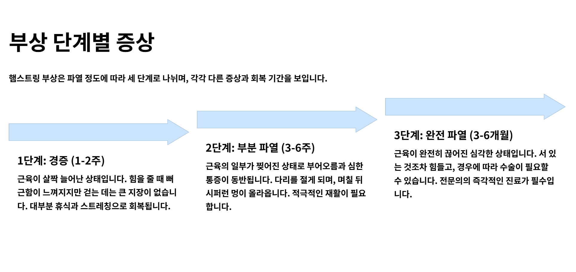 - 3단계 (완전 파열): 근육이 완전히 끊어진 상태로, 서 있는 것조차 힘들고 경우에 따라 수술이 필요할 수도 있는 심각한 상황입니다.