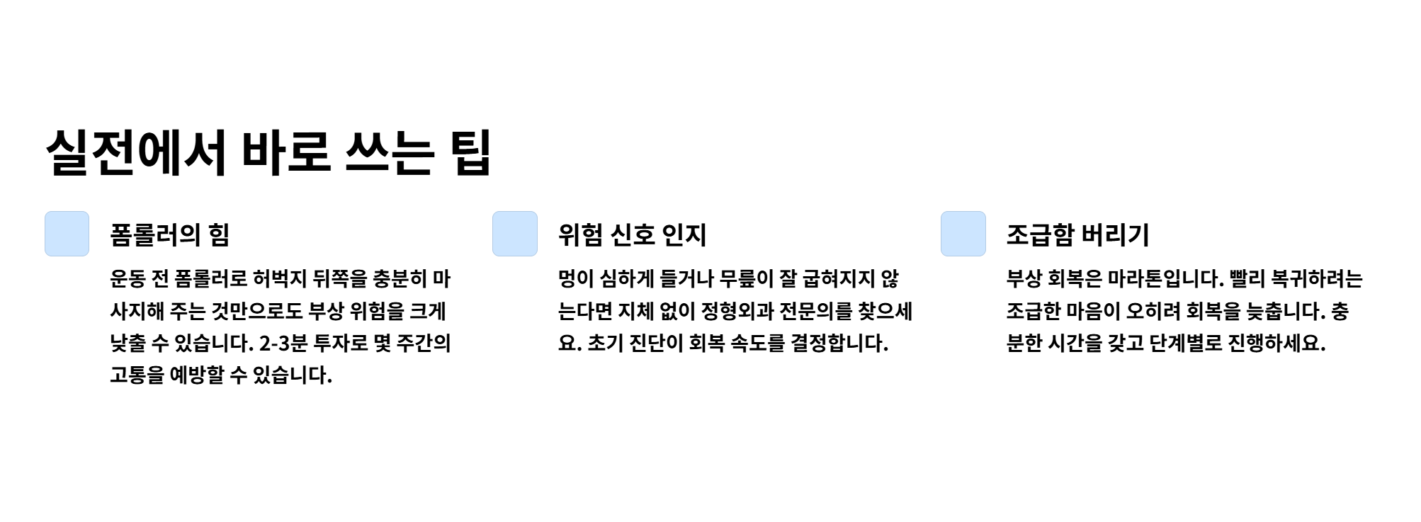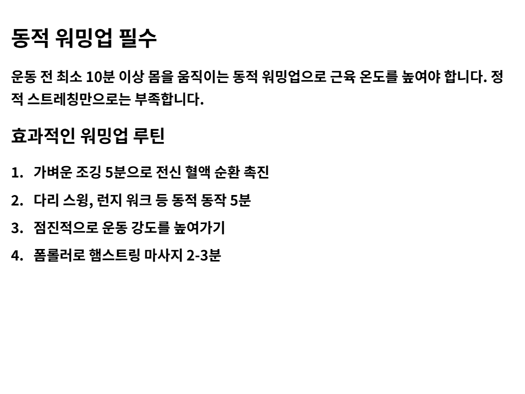 - 실전 팁 1: 운동 전 폼롤러로 허벅지 뒤쪽을 충분히 마사지해 주는 것만으로도 부상 위험을 크게 낮출 수 있습니다.