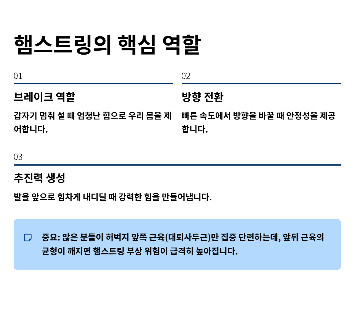 보통 '허벅지 뒷근육'이라고 짧게 부르지만, 사실 햄스트링은 세 개의 커다란 근육(반건양근, 반막양근, 대퇴이두근)이 모여 있는 근육 그룹을 말합니다. 우리가 달리거나 걸을 때 자동차의 '브레이크' 역할을 한다고 생각하면 이해가 쉬워요. 갑자기 멈춰 서거나 방향을 바꿀 때, 혹은 발을 앞으로 힘차게 내디딜 때 이 근육이 엄청난 힘을 버텨내야 하죠.