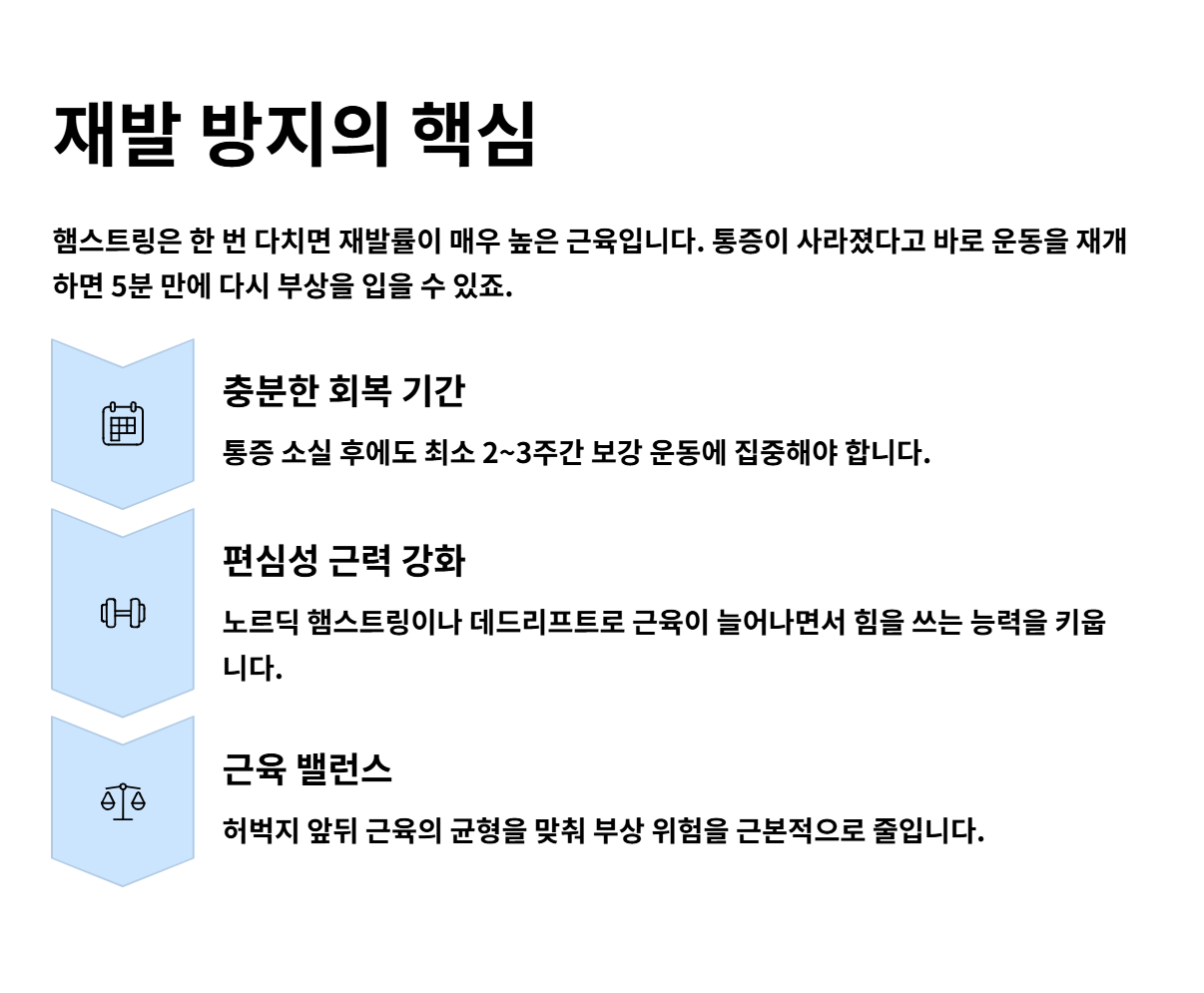 햄스트링은 한 번 다치면 재발률이 굉장히 높은 근육입니다. 다 나았다고 생각해서 다시 필드로 나갔다가 5분 만에 다시 쓰러지는 경우를 정말 많이 봤어요. 그래서 통증이 사라진 뒤에도 최소 2~3주간은 보강 운동에 집중해야 합니다.