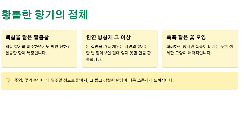 백합 향기와 비슷하면서도 훨씬 진하고 달콤한 향이 온 집안을 가득 채우는데, 이 향기를 한 번 맡아본 분들은 절대 잊지 못한다고 하죠. 저도 처음 향기를 맡았을 때 "세상에 이런 천연 방향제가 어디 있을까" 싶을 정도로 황홀했습니다.