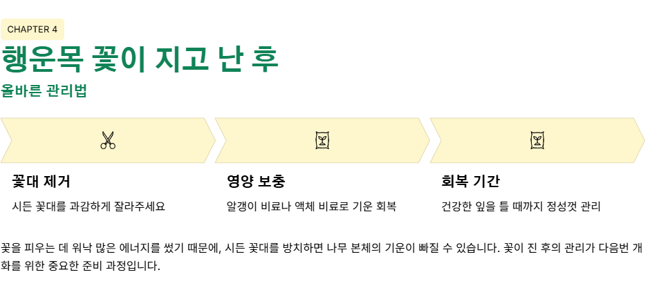 꽃이 피었을 때의 감동도 크지만, 꽃이 지고 난 후의 관리도 매우 중요합니다. 꽃이 시들기 시작하면 꽃대 부분을 과감하게 잘라주는 것이 좋습니다. 꽃을 피우는 데 워낙 많은 에너지를 썼기 때문에, 시든 꽃대를 방치하면 나무 본체의 기운이 빠질 수 있거든요.
