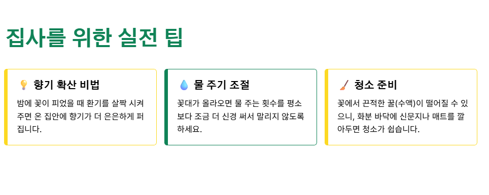 - 밤에 꽃이 피었을 때 환기를 살짝 시켜주면 온 집안에 향기가 더 은은하게 퍼집니다.