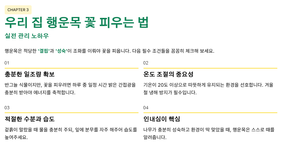- 인내심: 가장 중요한 것은 조급해하지 않는 마음입니다. 나무가 충분히 나이를 먹고 환경이 딱 맞았을 때, 행운목은 스스로 때를 알려줍니다.