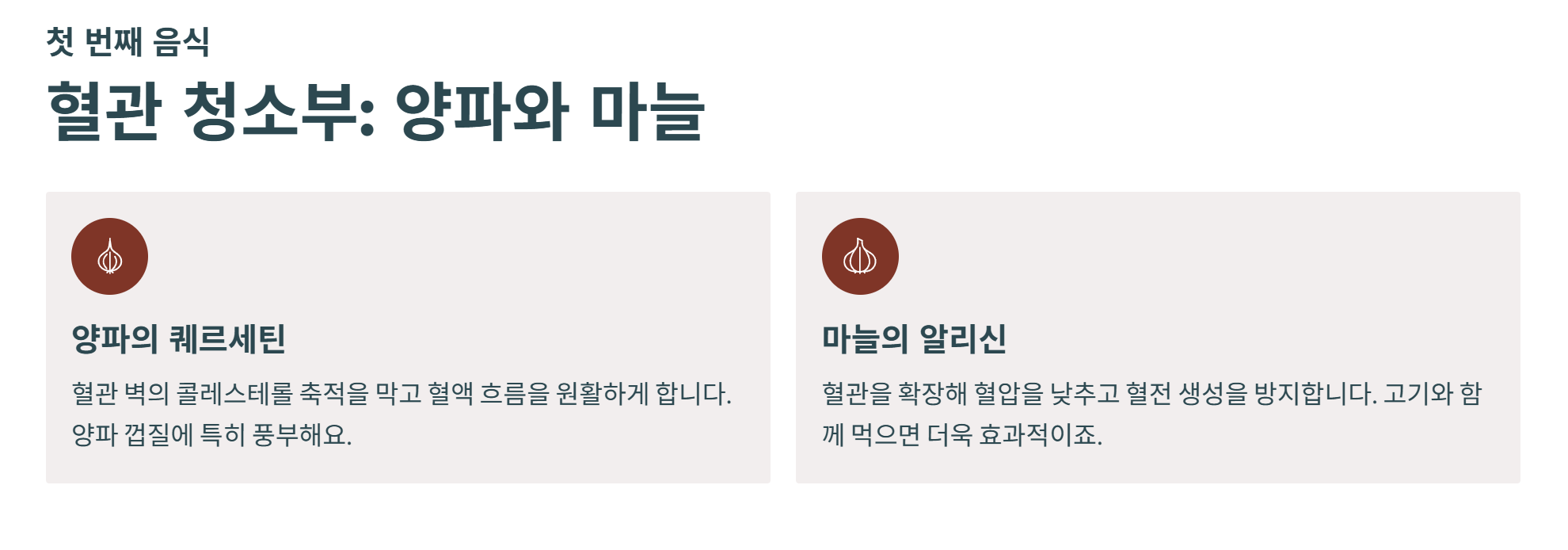 우리 식탁에 빠지지 않는 양파와 마늘은 혈액순환의 일등 공신입니다. 양파에 풍부한 '퀘르세틴' 성분은 혈관 벽에 콜레스테롤이 쌓이는 것을 막아주고 혈액의 흐름을 원활하게 도와줍니다. 특히 양파 껍질에 이 성분이 많다고 해서 저는 육수를 낼 때 껍질을 꼭 함께 사용하곤 해요.