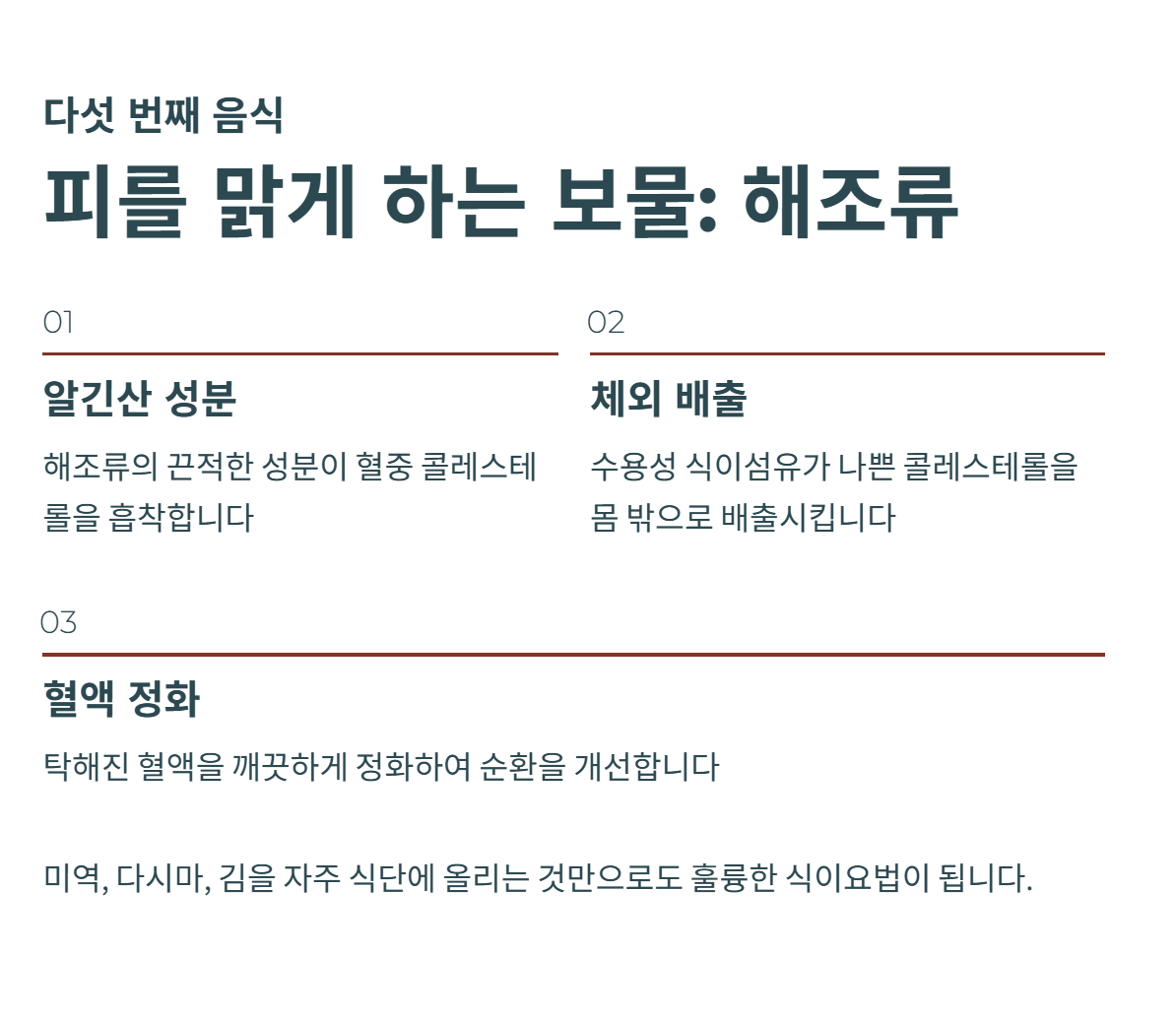 미역, 다시마, 김 같은 해조류는 '피를 맑게 하는 음식'의 대명사죠. 해조류 특유의 끈적끈적한 성분인 '알긴산'은 수용성 식이섬유의 일종으로, 혈중 콜레스테롤을 흡착해 몸 밖으로 배출해주는 역할을 합니다.