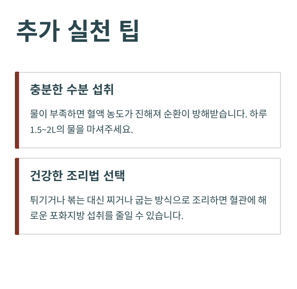 - 실전 팁 1: 음식 섭취만큼 중요한 것이 바로 '수분 보충'입니다. 물이 부족하면 혈액의 농도가 진해져 순환이 방해받으니 하루 1.5~2L의 물을 꼭 마셔주세요.