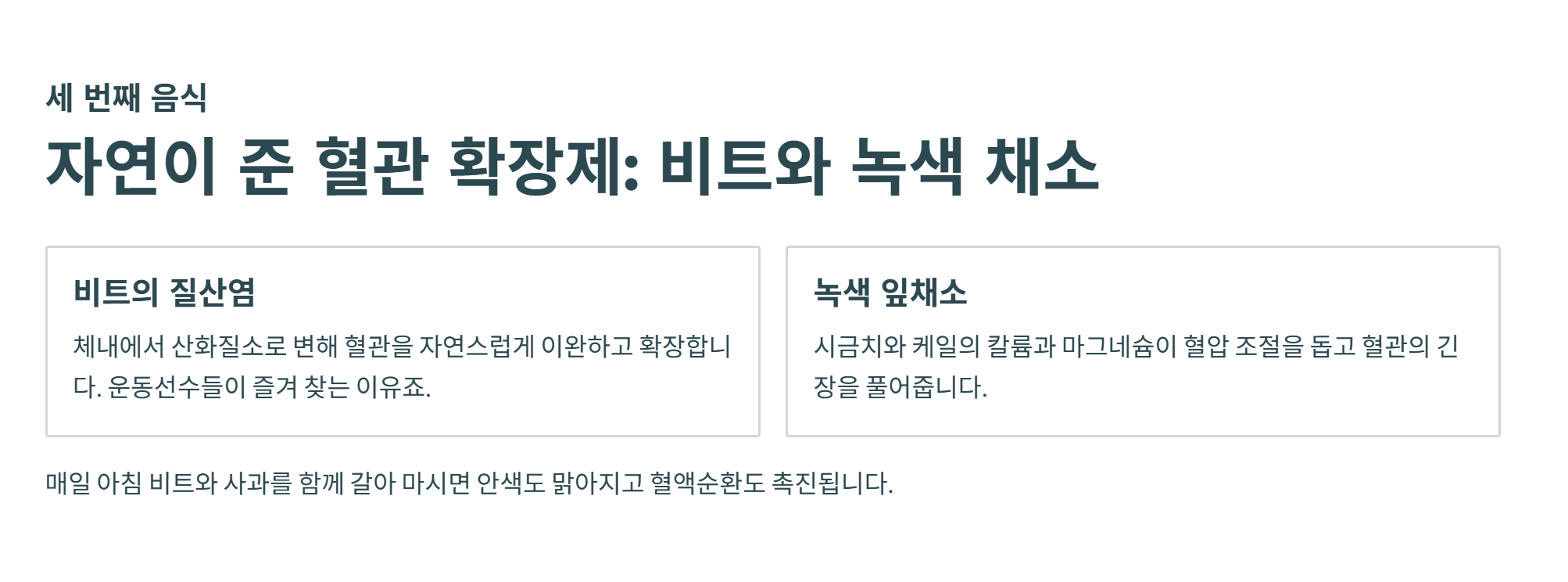 - 아침마다 비트나 녹색 채소를 곁들인 식단을 통해 혈관을 확장시켜 보세요.