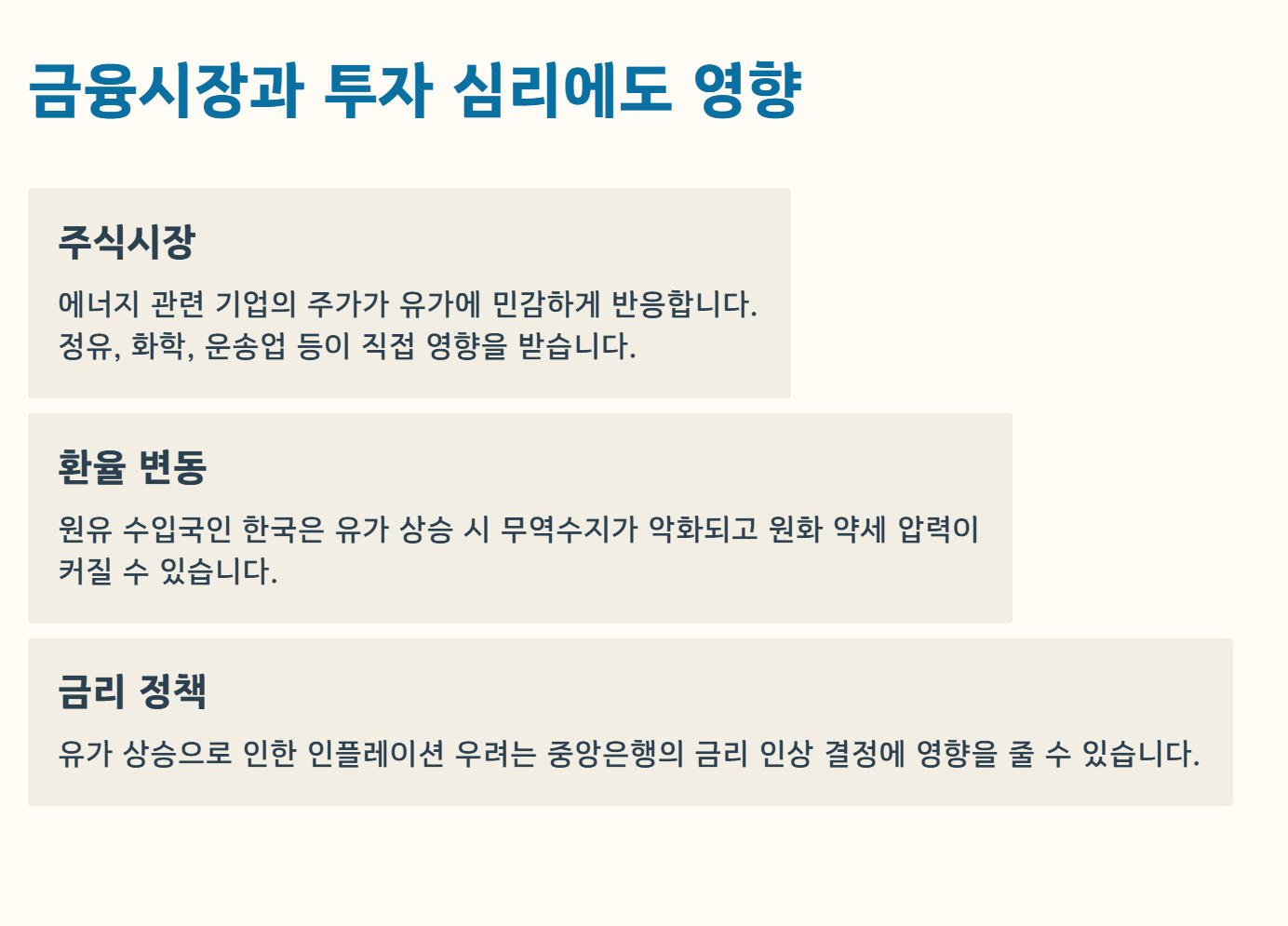 유가 상승은 곧바로 연료비와 운송비 인상으로 이어지고, 이는 식료품과 공산품 가격에도 영향을 줍니다. 실제로 유가가 오를 때 체감 물가가 빠르게 상승하는 경험을 많은 분들이 하고 계실 것입니다.