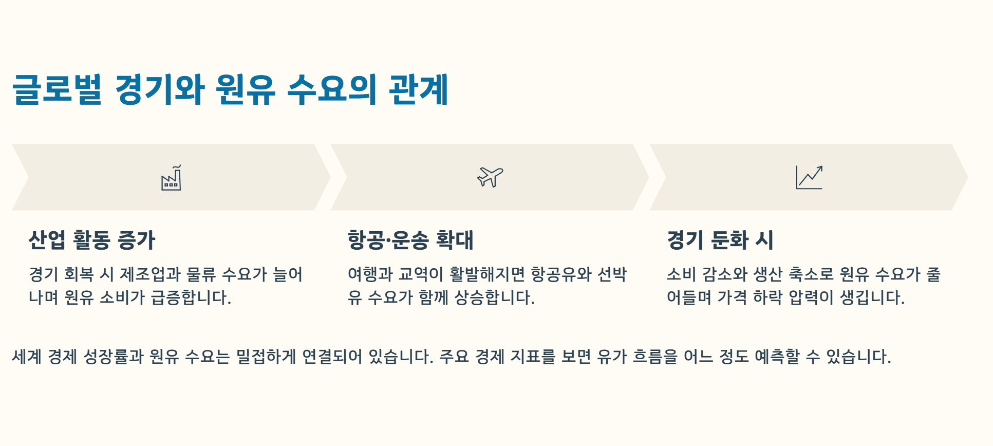 세계 경제가 회복 국면에 들어서면 원유 수요가 증가하고, 경기 둔화 시에는 수요가 감소합니다. 산업 활동과 물류, 항공 수요까지 모두 원유 소비와 연결되어 있어 경제 지표와 유가는 밀접하게 움직입니다.